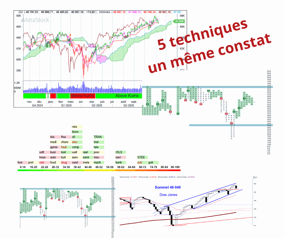 Cinq techniques, chacune avec son propre langage, pointent toutes vers la même direction : un repli à venir. Quand plusieurs approches convergent, ce n’est jamais un hasard… c’est souvent le marché qui chuchote avant de parler plus fort.
